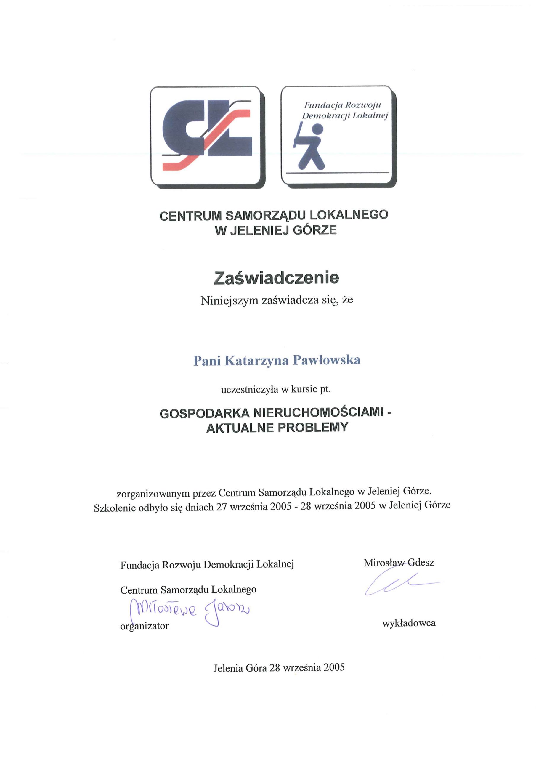 W 2004 r. ukończyłam studia na kierunku Geodezja i Kartografia na specjalności gospodarka nieruchomościami.