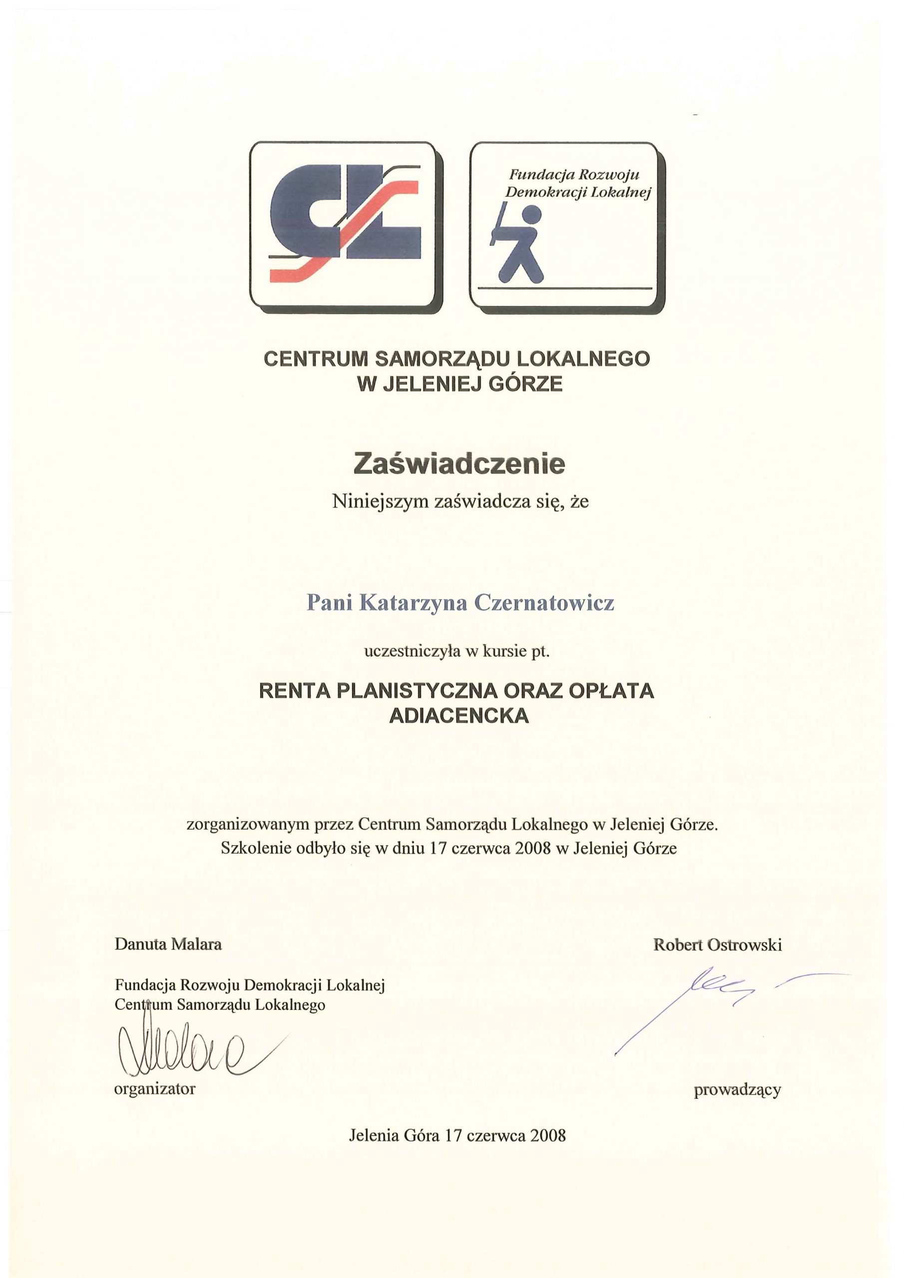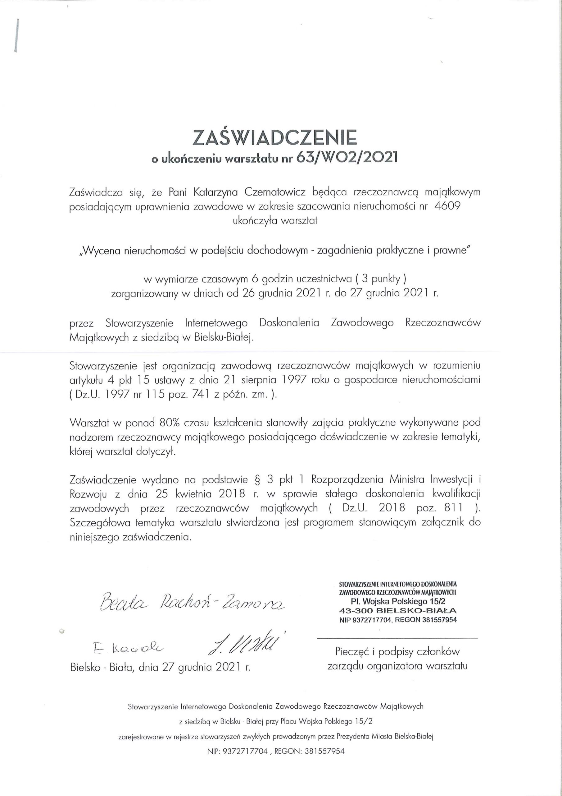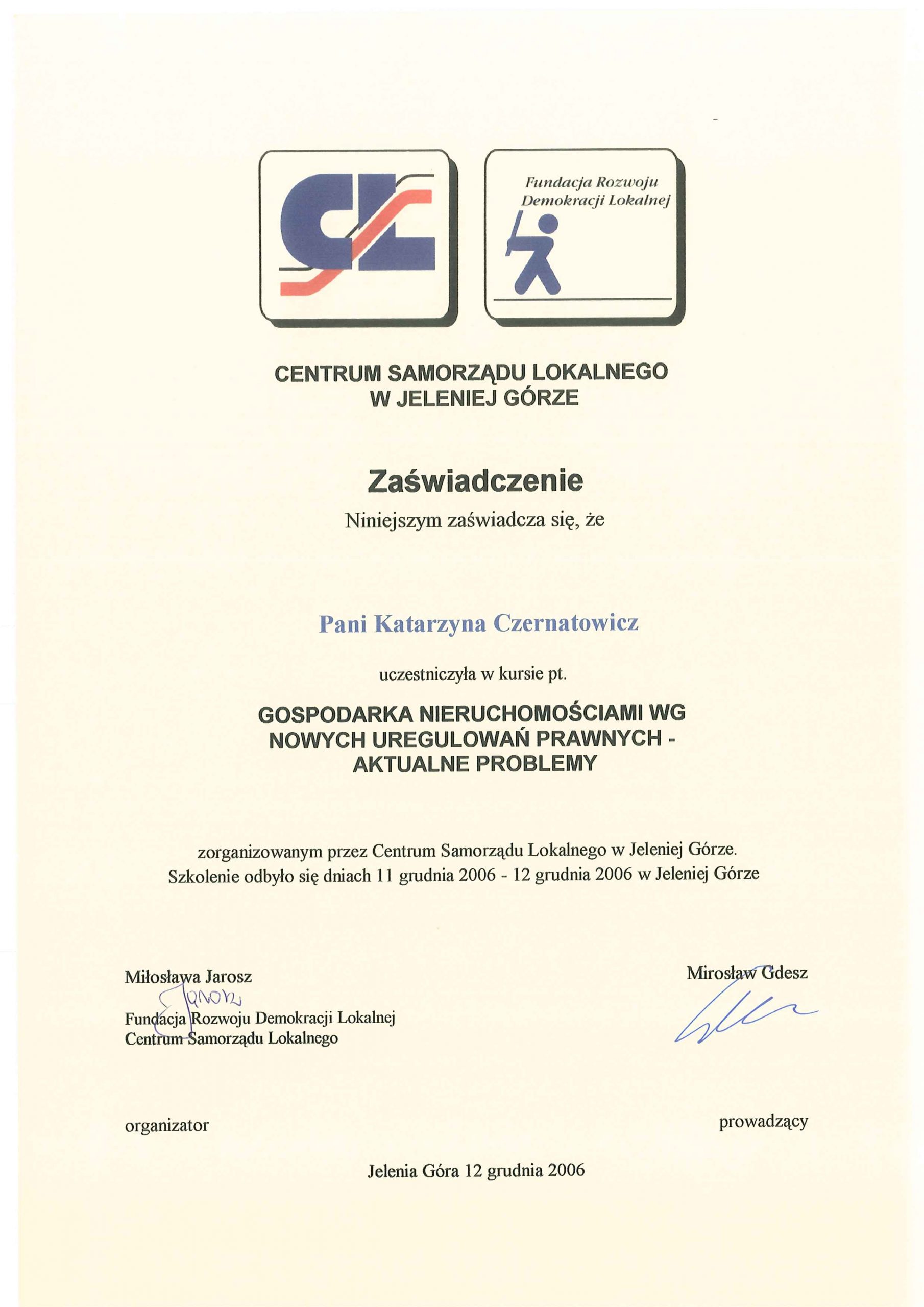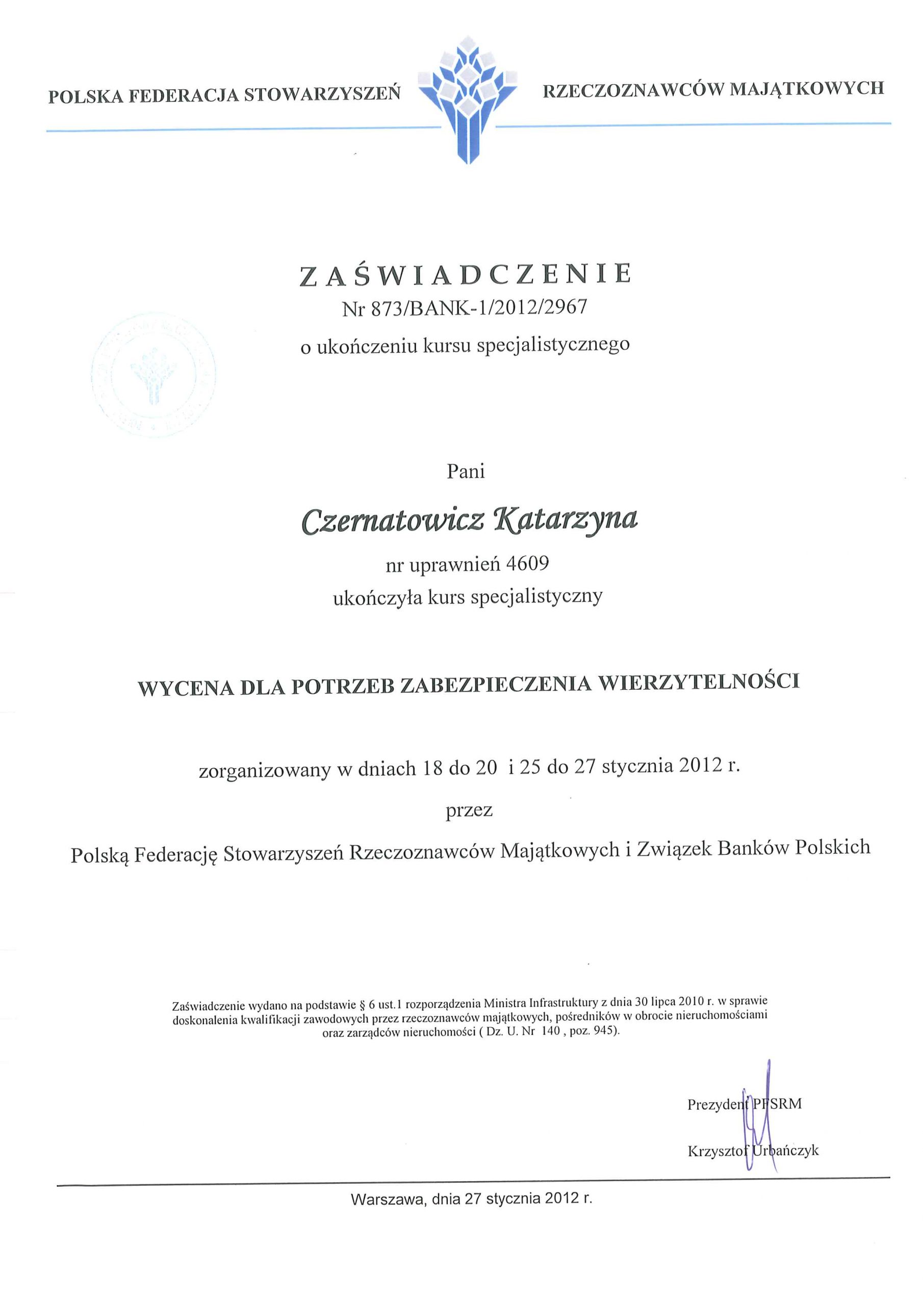 Certyfikat nr 62/2012 z dnia 13.03.2012 r. - wpis na listę rzeczoznawców Związku Banków Polskich na podstawie egzaminu z wyceny dla potrzeb zabezpieczeń wierzytelności bankowych pod Patronatem Polskiej Federacji Stowarzyszeń Rzeczoznawców Majątkowych i Związku Banków Polskich.