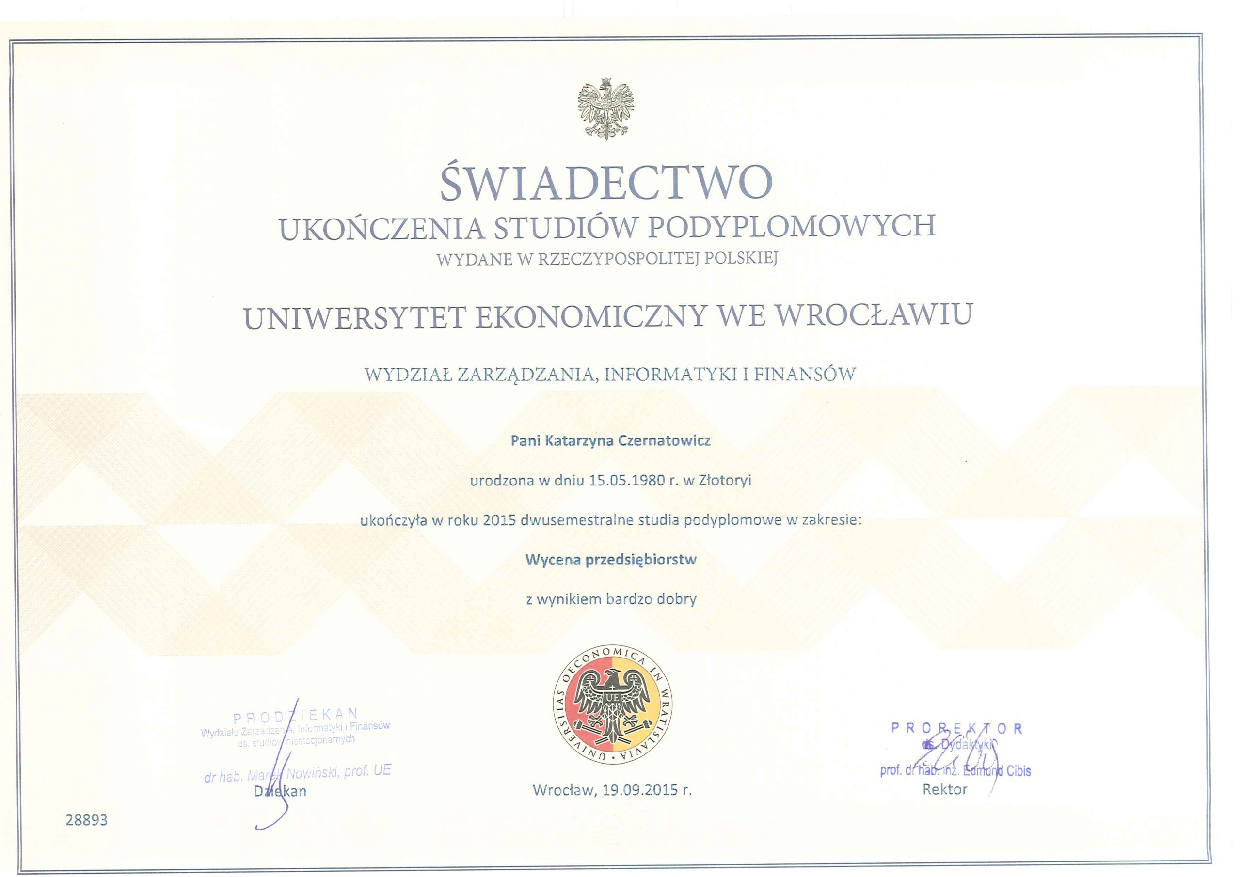 Świadectwo Ukończenia Studiów Podyplomowych Uniwersytetu Ekonomicznego we Wrocławiu – Wycena Przedsiębiorstw, 19.09.2015 r.