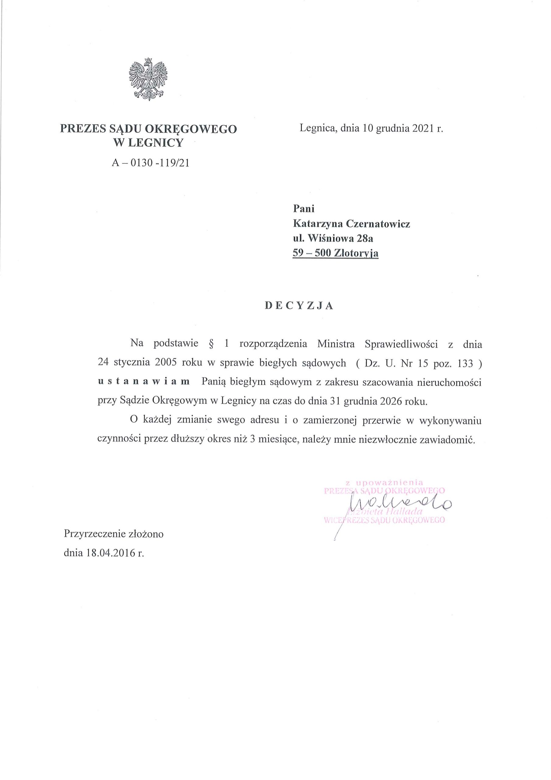 Biegły sądowy w zakresie szacowania nieruchomości przy Sądzie Okręgowym w Legnicy